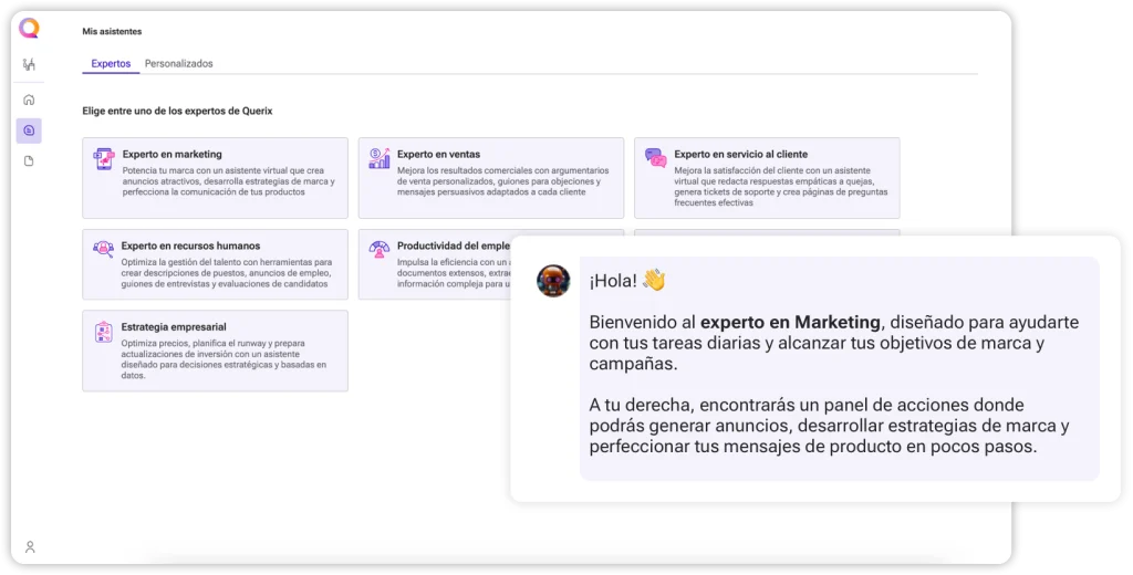 No necesitas ser un experto en marketing, ventas, RR. HH. o estrategia. Querix te ofrece asistentes expertos, listos para trabajar por ti con un solo clic.