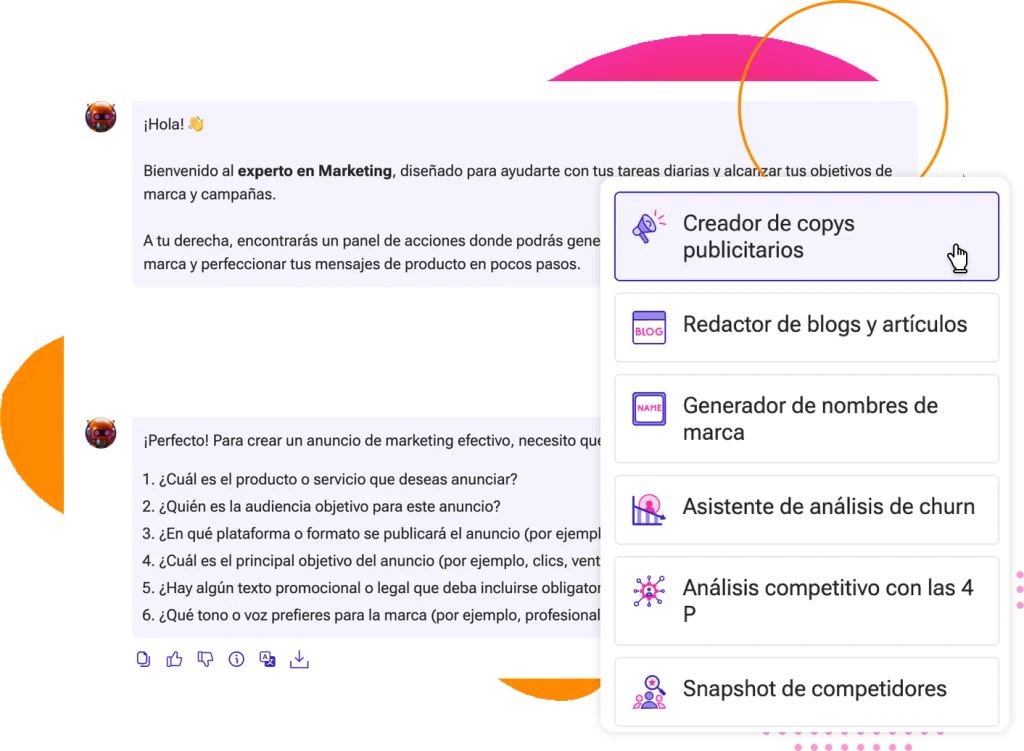 Eleva la presencia de tu marca con un asistente virtual que crea anuncios atractivos, desarrolla estrategias de marca y mejora el mensaje de tus productos.